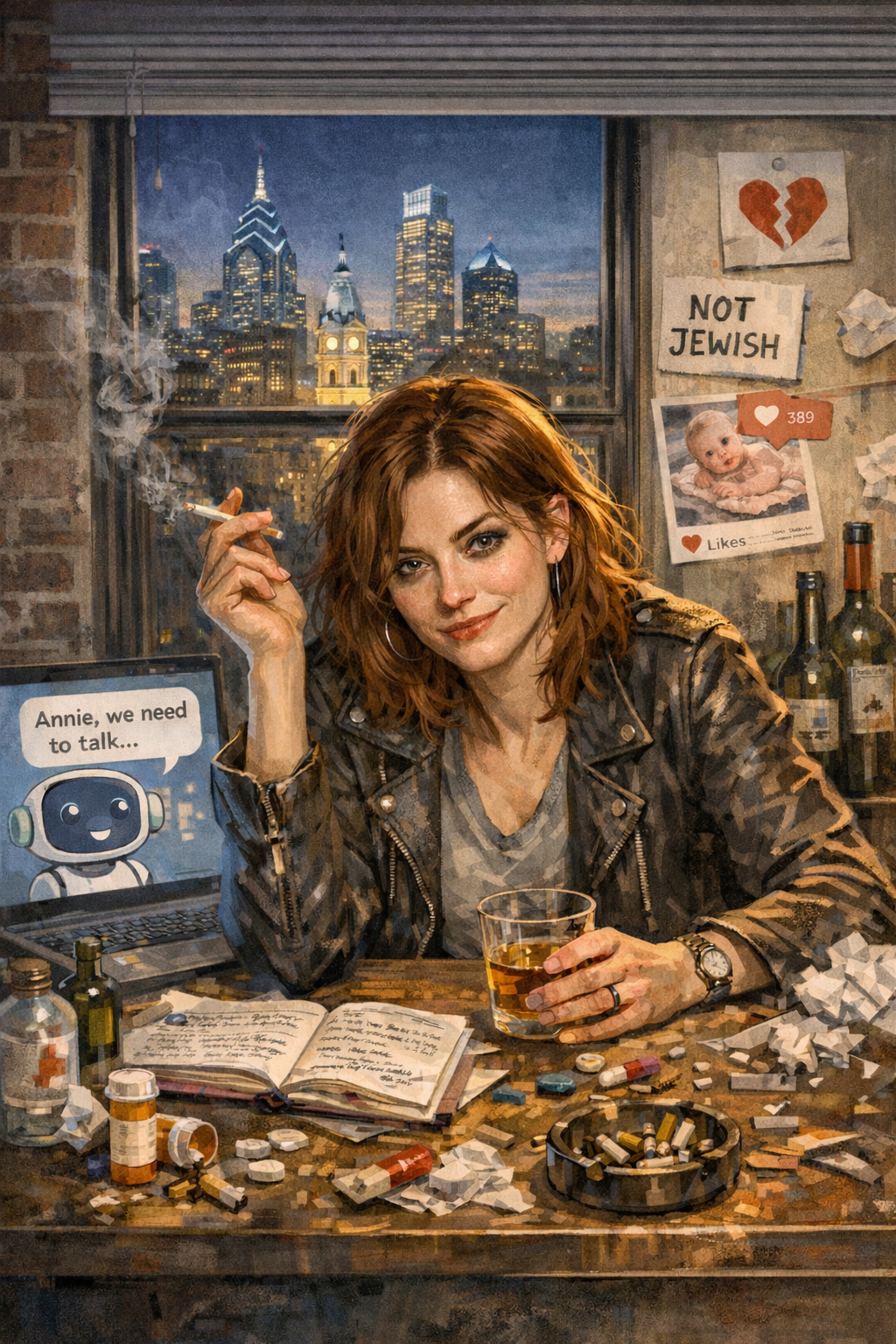 Annie Hannigan Jr. is brilliant at rejection, addiction, and making strangers laugh at the worst possible moment. While her peers are posting nursery photos on Instagram, Annie is busy finding out she isn’t Jewish and making an AI chatbot her unwilling “sponsor,” editor, and conscience. Living in Philadelphia as a writer now, she picks fights, flirts with disaster, and keeps returning to one humiliating truth: she wants love and attention the way an orphan wants a home, even when she pretends she’s above it.
